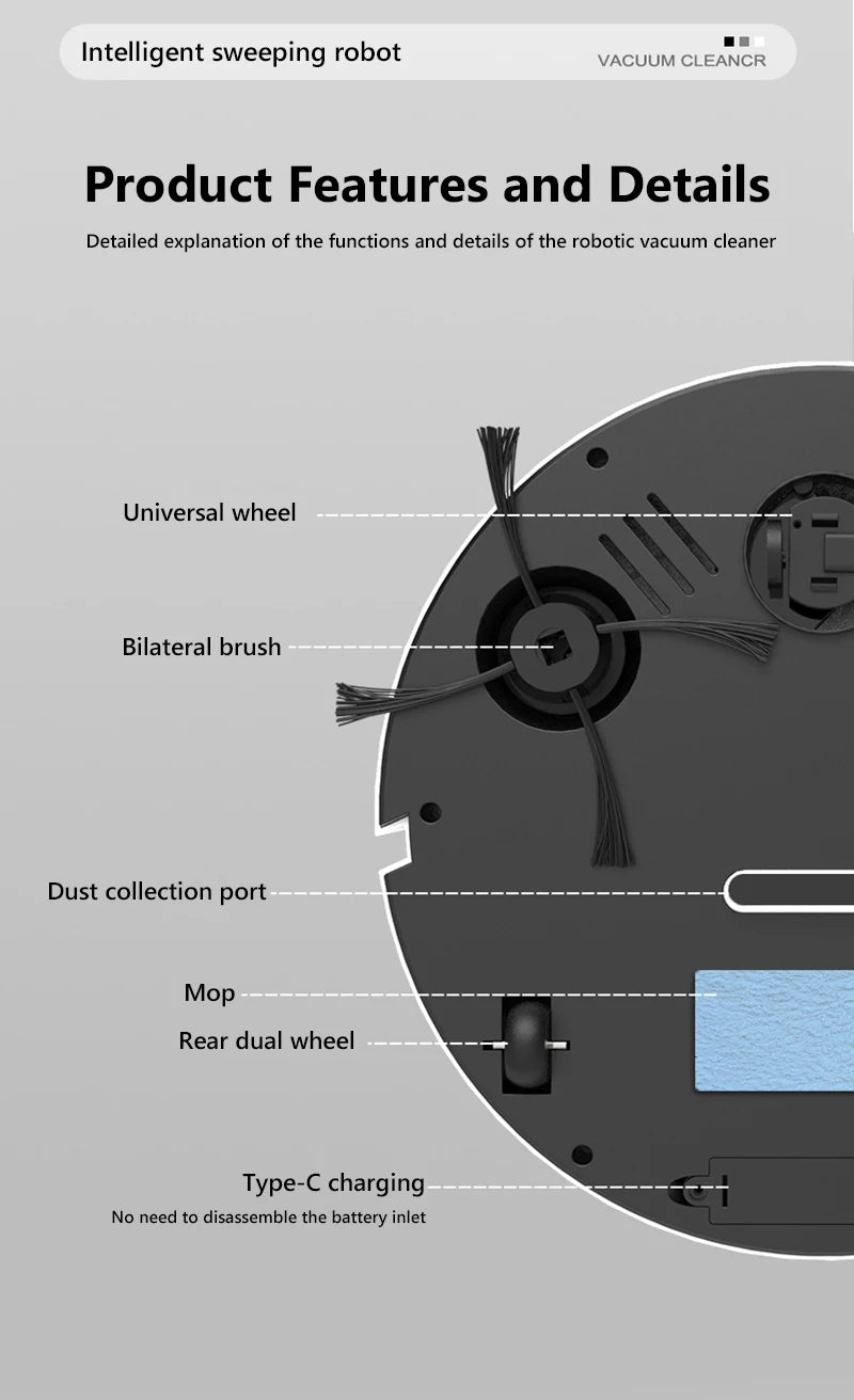 - 6000Pa Ultra-Strong Suction: Deep-cleans pet hair, dust, crumbs, and debris with adjustable suction for different surfaces.